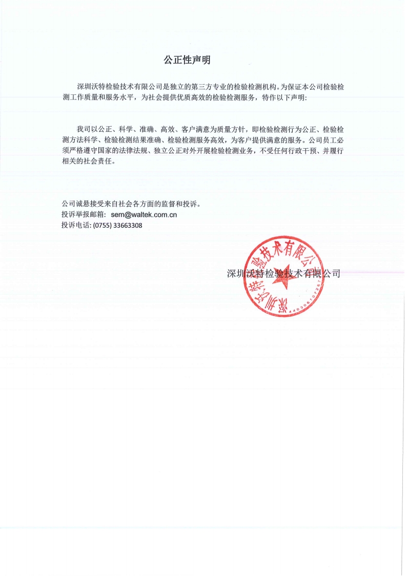 公正性聲明(深圳市沃特測試技術服務有限公司)