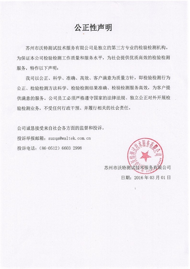 公正性聲明(蘇州市沃特測試技術服務有限公司)