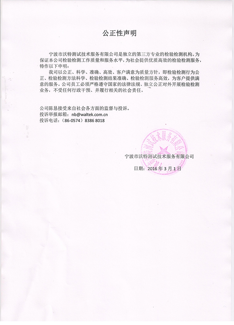 公正性聲明(寧波市沃特測試技術服務有限公司)