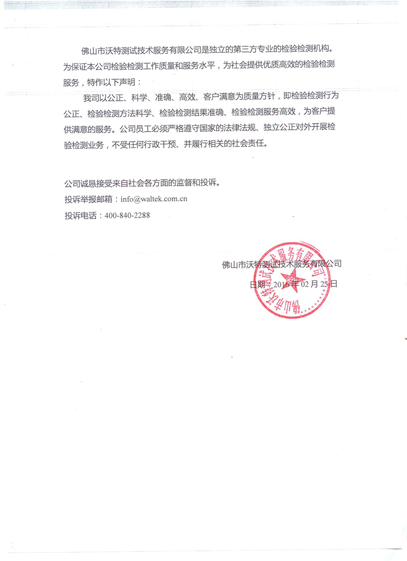 公正性聲明(佛山市沃特測試技術服務有限公司)