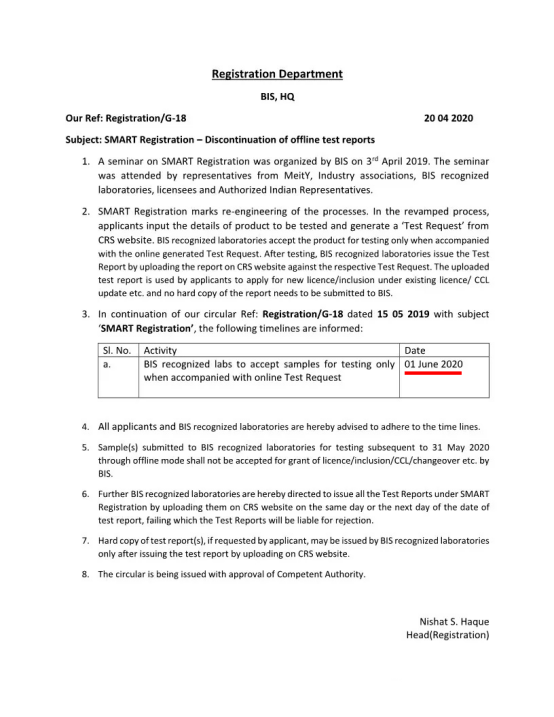 3. 2020年5月31日之后,BIS對經(jīng)由線下模式向BIS認(rèn)可實(shí)驗(yàn)室發(fā)出測試申請的樣品一律不予Fresh發(fā)證/Inclusion發(fā)證/CCL報(bào)備/換版發(fā)證。