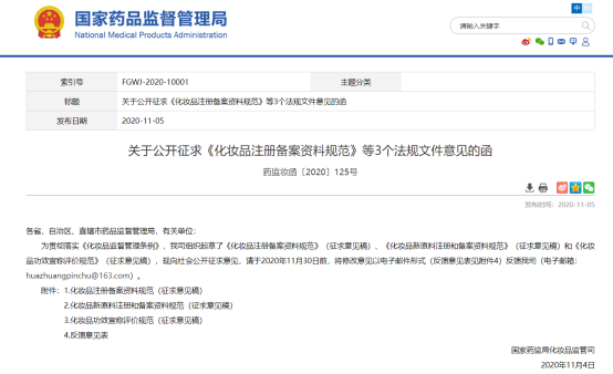 為規(guī)范化妝品和化妝品新原料注冊備案管理工作與化妝品功效宣稱評價工作,保證化妝品和化妝品新原料注冊、備案各項資料的規(guī)范提交,功效宣稱評價結(jié)果的科學(xué)性和準(zhǔn)確性。2020115日,國家藥品監(jiān)督管理局官網(wǎng)發(fā)布關(guān)于公開征求《化妝品注冊備案資料規(guī)范》等3個法規(guī)文件意見的函。