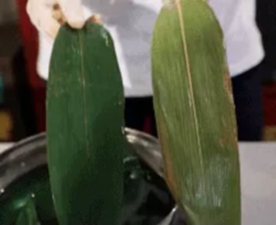 “返青粽葉”色澤青綠,看上去很漂亮,而正常粽葉在制作過程中經過高溫蒸煮,顏色會發暗發黃。