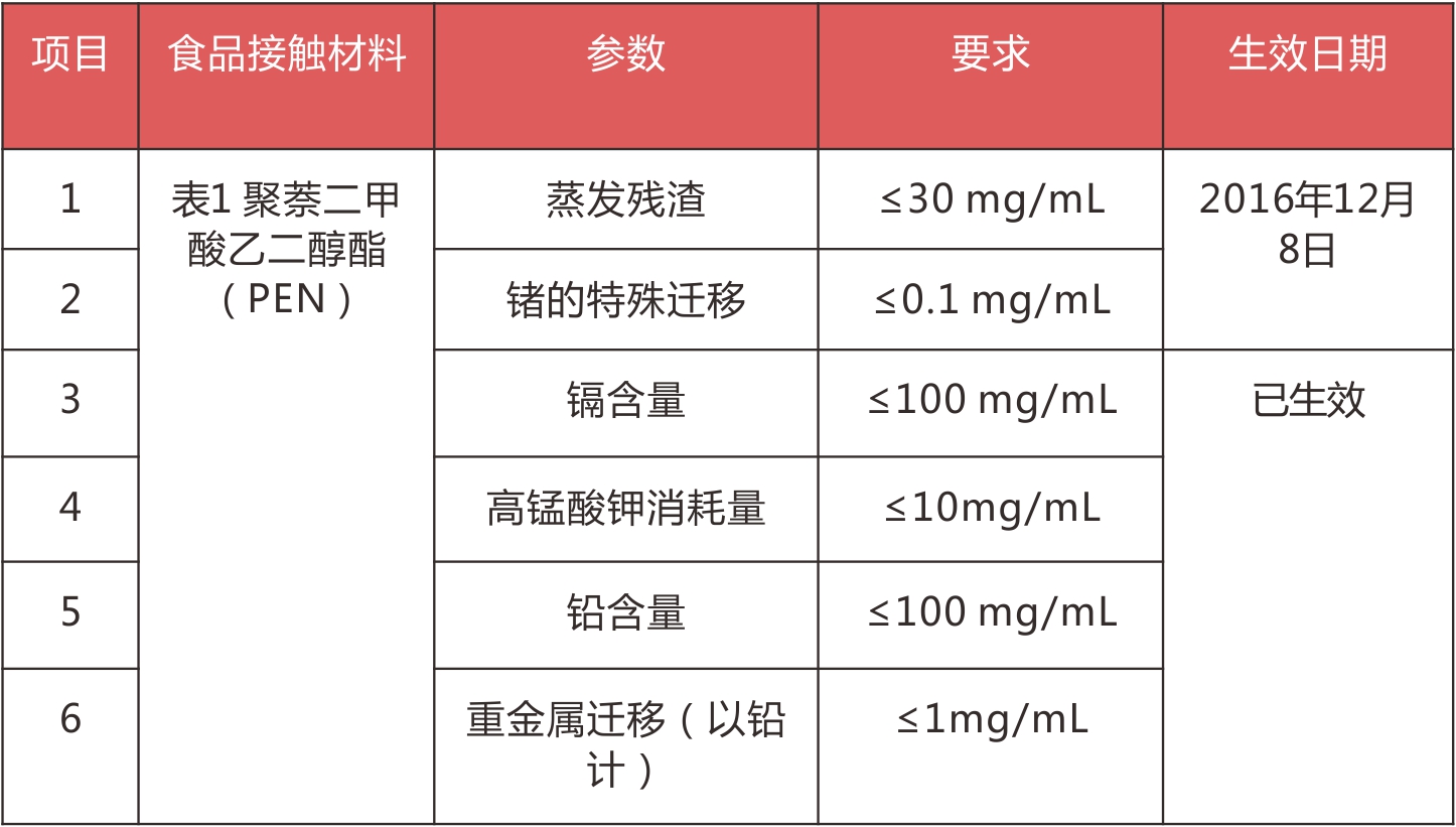 2016年6月8日,日本厚生勞動省(MHLW)公布了2016年第245號通知,規定食品接觸PEN材料和物品的使用,或以PEN作為主要成分而制造出的食品接觸材料和物品的使用。新法強制執行蒸發殘渣和鍺遷移的要求。