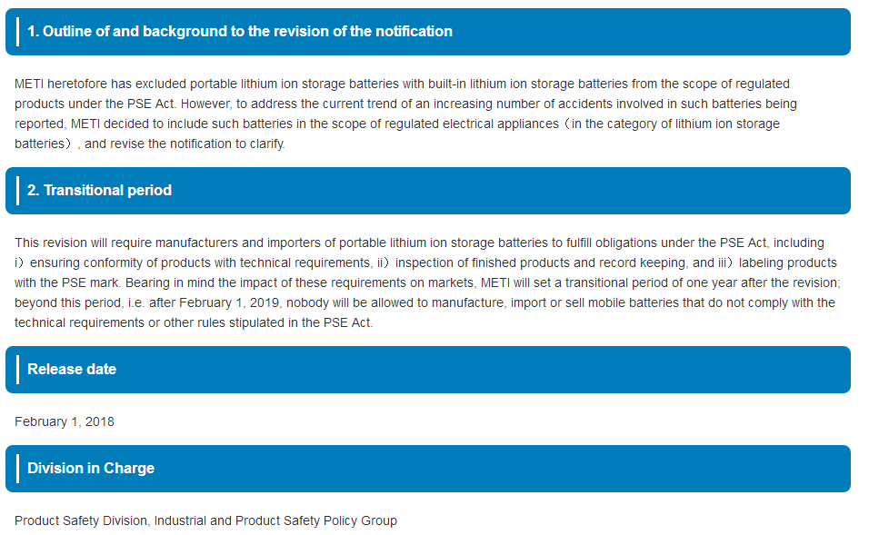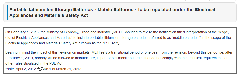 2018年2月1日,日本經(jīng)濟產(chǎn)業(yè)省METI發(fā)布公告,針對圓形PSE管控對象的鋰電池范圍進行了內(nèi)容修訂。新增便攜式電器的鋰電子電池和便攜式電池組為圓形PSE管控對象。