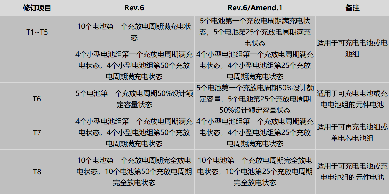 目前,聯合國發(fā)布的UN38.3最新版本為ST/SG/AC.10/11/Rev.6/Amend.1,其中涉及的修訂有: