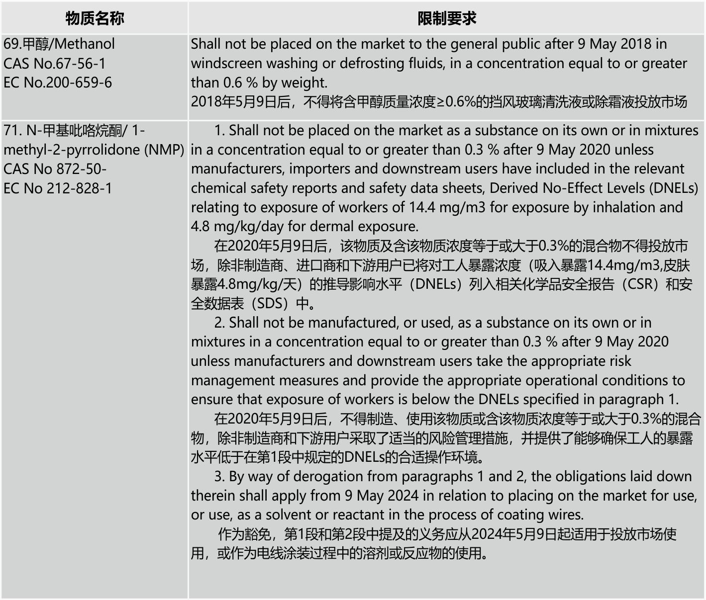 REACH附錄17限制物質新增甲醇和NMP限制條款