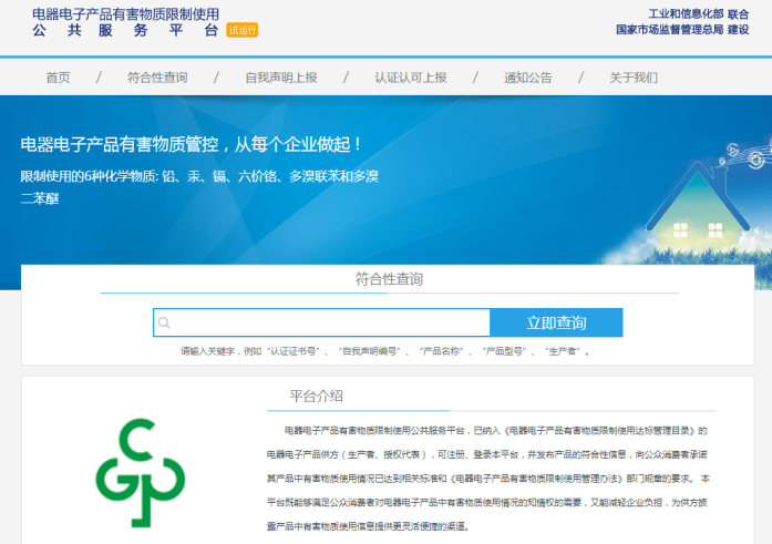 2019年10月8日,由工業和信息化部聯合國家市場監督管理總局建設的電器電子產品有害物質限制使用公共服務平臺已上線并進行試運行。