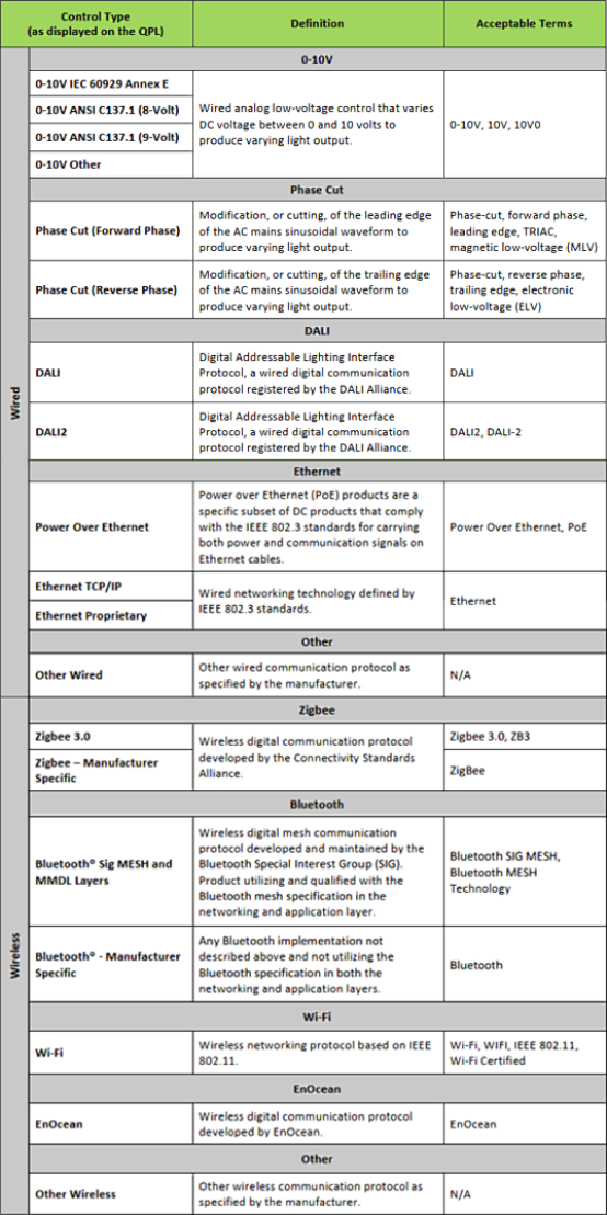 (2) 此外針對調光和控制功能、控制屬性、接受/傳輸硬件這些產品信息描述,DLC也要求提供相關的控制標準/協議(從下表中)。