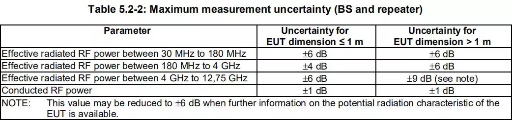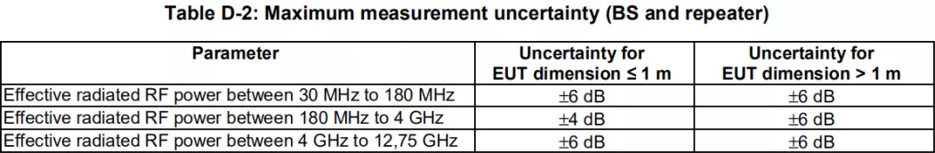 2) 新版本V13.1.1將要求最大測(cè)量不確定度的推薦值列表放到了附錄D,并對(duì)基站和中繼站的推薦值范圍進(jìn)行了修改: