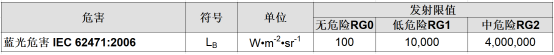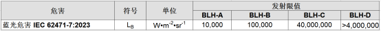 IEC 62471-7:2023同IEC 62471:2006的相比,對測試距離,各類危險重新進(jìn)行了類別和限值的劃分,其中最大的變化是更新了藍(lán)光危害的分類和限值: