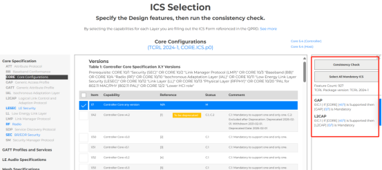 c) 下一步的“ICS選擇ICS Selection”,跟以前最大的區別就是:任何一層配置如有解鎖,都必須要重新測試提供測試證據。舊版的ICS選擇是可以做減法的,就是不支持是可以自由刪除它不支持,也不需要重新測試。新版的這種變化,導致了列名出現好多的問題,比如說,芯片廠的芯片功能支持BR/EDR/LE雙模,但給到下游終端客戶時只用到其中BR/EDR 或LE單模,這樣做一致性核查(Consistency check)時就出現核心配置報問題了。