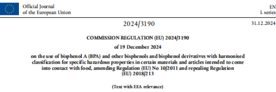 2024年12月31日,歐盟官方公報正式發布BPA禁令(EU) 2024/3190,該要求進一步修訂塑料法規(EU) No 10/2011,同時廢除(EU) 2018/213。
