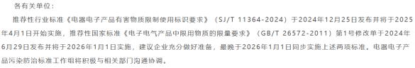 2024年1月14日,電器電子產(chǎn)品污染防治標(biāo)準(zhǔn)工作組發(fā)布了關(guān)于《電器電子產(chǎn)品有害物質(zhì)限制使用標(biāo)識(shí)要求》(SJ/T11364-2024)和《電子電氣產(chǎn)品中限用物質(zhì)的限量要求》(GB/T26572-2011)第1號(hào)修改單兩項(xiàng)標(biāo)準(zhǔn)協(xié)同實(shí)施的說(shuō)明通知。