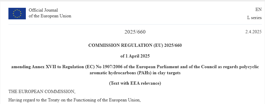 歐盟官方公報(bào)于2025年4月2日發(fā)布法規(guī)(EU) 2025/660,修訂REACH法規(guī)【(EC) No 1907/2006)】附錄XVII中關(guān)于粘土靶材中多環(huán)芳烴(PAHs)的規(guī)定。 本次修訂自歐盟官方公報(bào)上公布后的第二十天生效,即2025年4月21日開始生效。