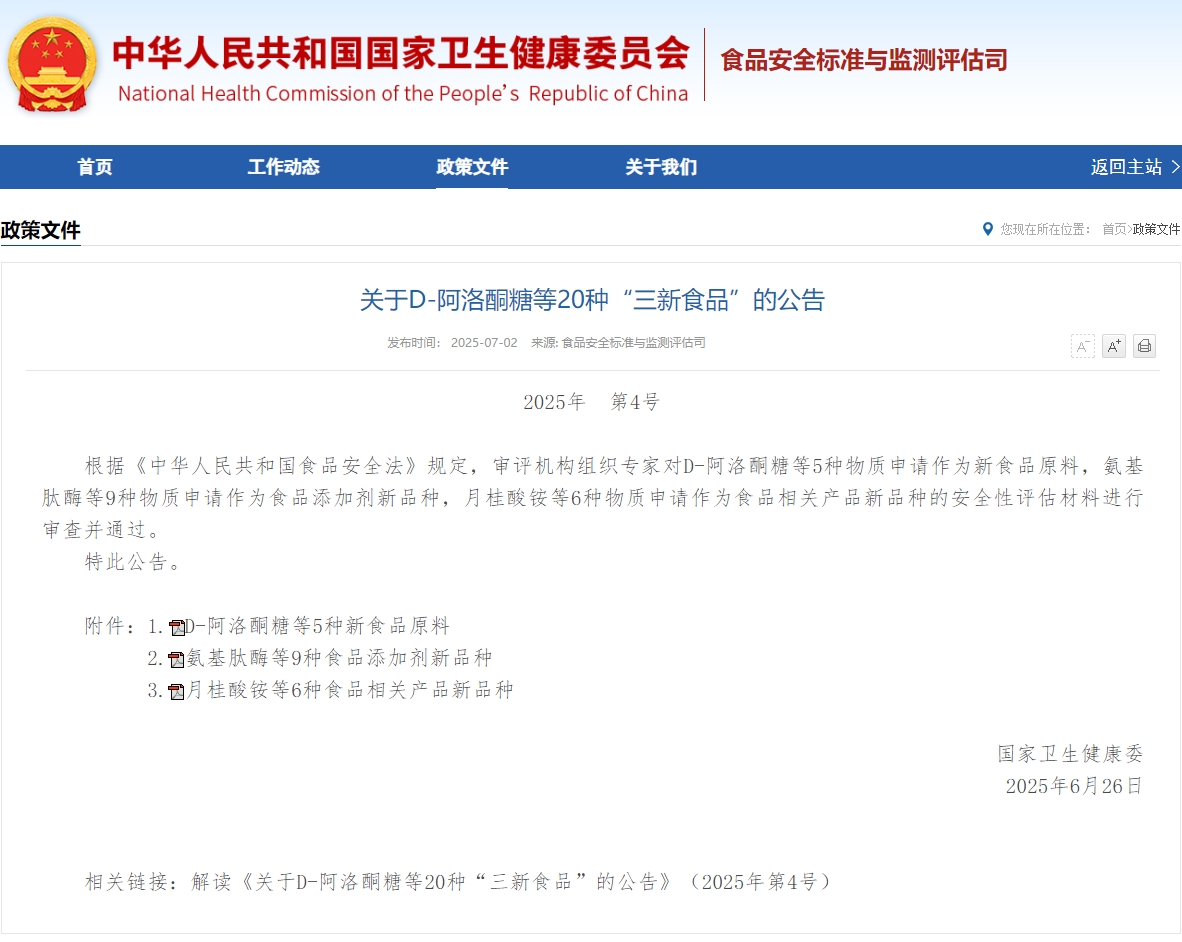 解讀《關于D-阿洛酮糖等20種“三新食品”的公告》(2025年第4號)