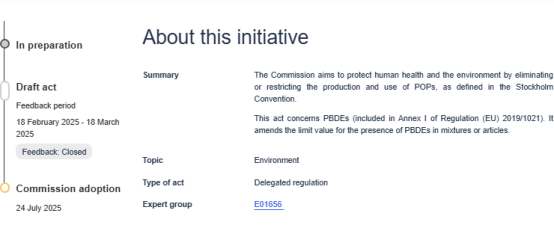 2025年7月24日,歐盟委員會通過了關于PBDEs的POPs修訂草案,該草案擬議對PBDEs(多溴二苯醚)管控限值進行調整,后期歐盟將在其官方公報上正式發布修訂法規。
