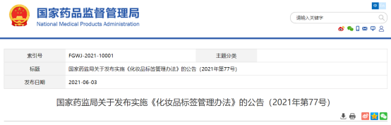 2021年6月3日,國家藥監局在其官網發布了實施《化妝品標簽管理辦法》(以下簡稱《辦法》)的公告。
