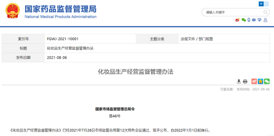 2021年8月6日,國家市場監督管理局在其官網發布了《化妝品生產經營監督管理辦法》(下稱《辦法》),并于2022年1月1日起正式施行。