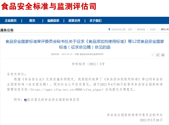 今年3月30日,食品安全國(guó)家標(biāo)準(zhǔn)審評(píng)委員會(huì)秘書(shū)處發(fā)布了關(guān)于征求《食品添加劑使用標(biāo)準(zhǔn)》等12項(xiàng)食品安全國(guó)家標(biāo)準(zhǔn)(征求意見(jiàn)稿)意見(jiàn)的函,意見(jiàn)征求截止到4月30日。
