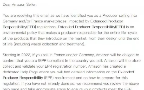 近期,陸續有歐洲站賣家收到亞馬遜的郵件通知:從2022年開始,如果賣家在德國或法國開店銷售商品,亞馬遜將有義務確認賣家在所銷售的國家或地區符合(EPR)規定,否則相關商品將被亞馬遜強制停售。