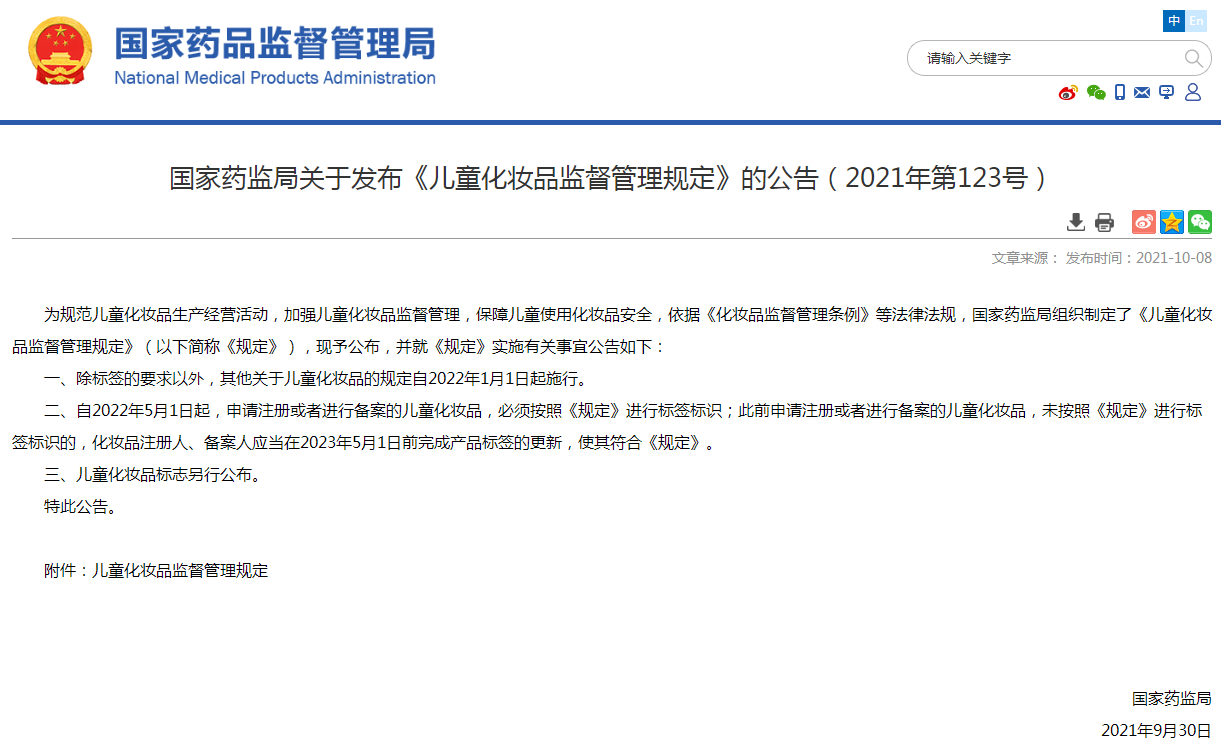 國家藥監局近日發布《兒童化妝品監督管理規定》,公告明確表示,除標簽的要求以外,其他關于兒童化妝品的規定自2022 年1月1日起施行。自2022年5月1日起,申請注冊或者進行備案的兒童化妝品,必須按照《規定》進行標簽標識;此前申請注冊或者進行備案的兒童化妝品,未按照《規定》進行標簽標識的,化妝品注冊人、備案人應當在2023年5月1日前完成產品標簽的更新,使其符合《規定》。