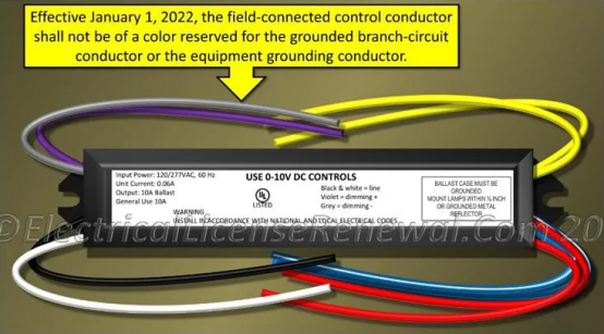 目前,市面上很多照明產(chǎn)品的控制器、LED驅動電源、熒光燈鎮(zhèn)流器通常采用白色導線作為零線,灰色導線作為控制電路(例如:調(diào)光)導線,然而根據(jù)NEC Section 200.7的要求,灰色和白色導線只能作為零線使用。不規(guī)范的顏色設置容易導致現(xiàn)場接線出現(xiàn)混淆,因而可能產(chǎn)生潛在危害。