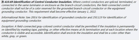 針對導線顏色易混淆的問題,NEC 2020版新增了Section 410.69,明確了控制電路導線絕緣顏色要求: