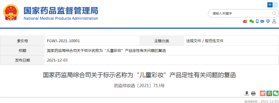 2021年12月3日,國家藥監局發布《國家藥監局綜合司關于標示名稱為“兒童彩妝”產品定性有關問題的復函》,對于大家所關注的“兒童彩妝”產品定性有關問題做出正面回應。