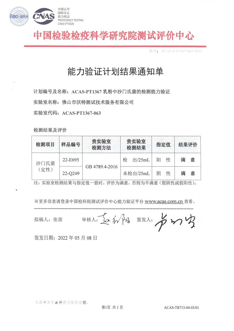 佛山沃特參加ACAS-PT1367乳粉中沙門氏菌的能力驗證獲“滿意”結(jié)果