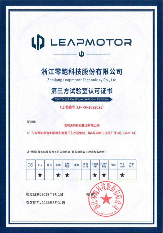 繼沃特檢驗實驗室在獲得合眾新能源、牛創新能源、摩登汽車、大運汽車、海馬汽車等第三方實驗室認可后,沃特檢驗集團再次通過浙江零跑科技股份有限公司評審,獲得了浙江零跑科技有限公司的第三方實驗室的資質認可。