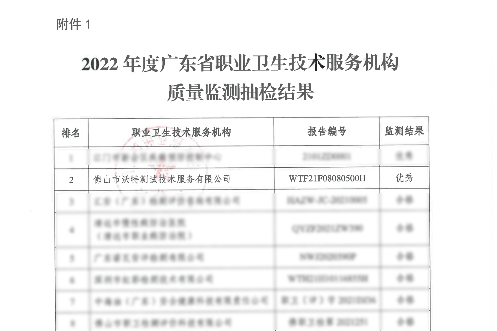近日,沃特檢驗集團佛山分公司收到了廣東省職業衛生技術質量控制中心的質量監測結果:佛山市沃特測試技術服務有限公司(以下簡稱“佛山沃特”)在2022年度廣東省職業衛生技術服務機構質量監測抽檢中,取得了“優秀”的優異成績,名列第二!