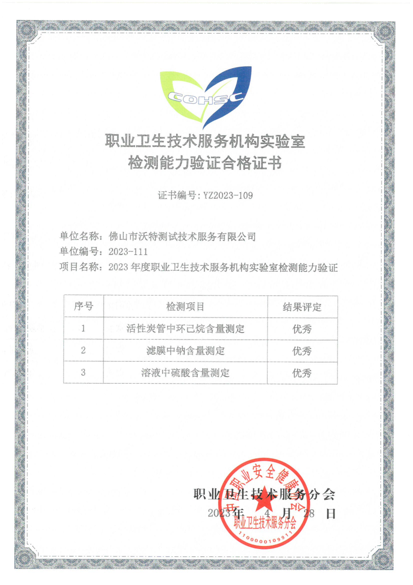 近日,佛山市沃特測試技術服務有限公司參加了由中國家衛生健康委組織開展的2023年度職業衛生技術服務機構實驗室檢測能力驗證活動,綜合評定結果為“優秀”。