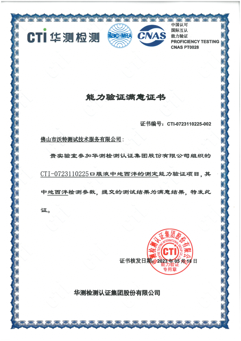 佛山沃特參加CTI-0723110225口服液中地西泮的測定獲“滿意”結果