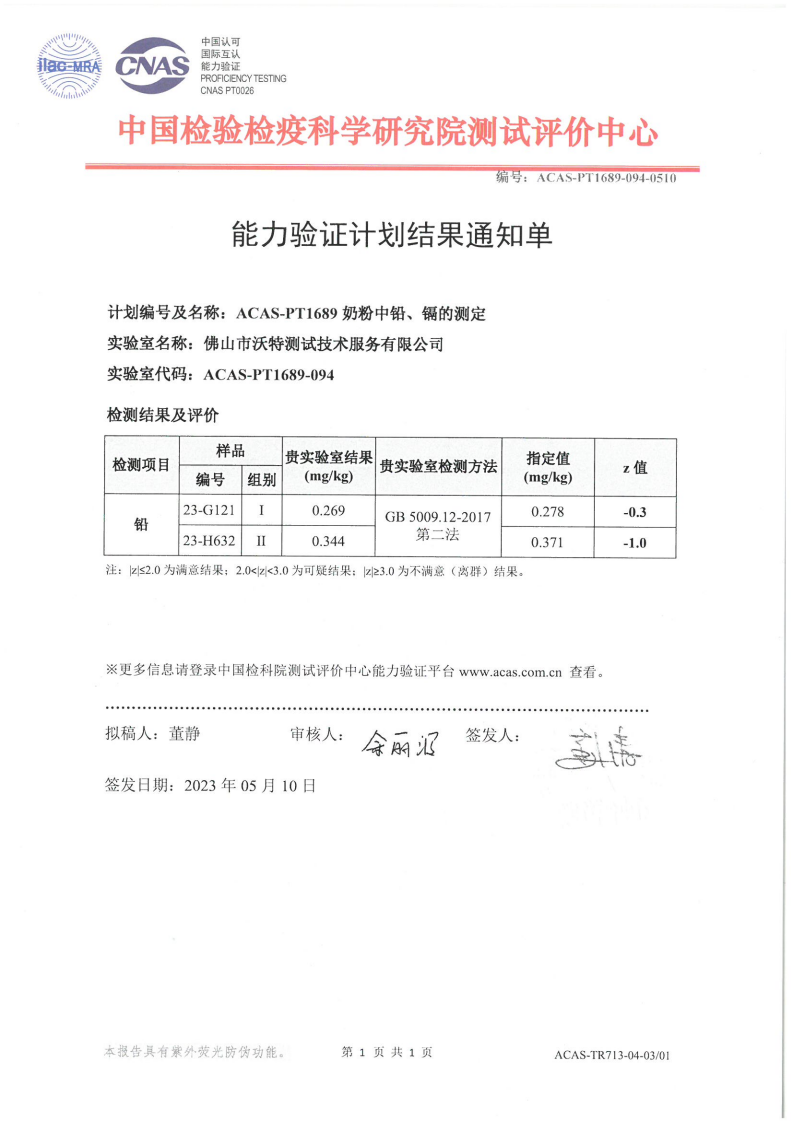 佛山沃特參加ACAS-PT1689奶粉中鉛的測定獲“滿意”結果