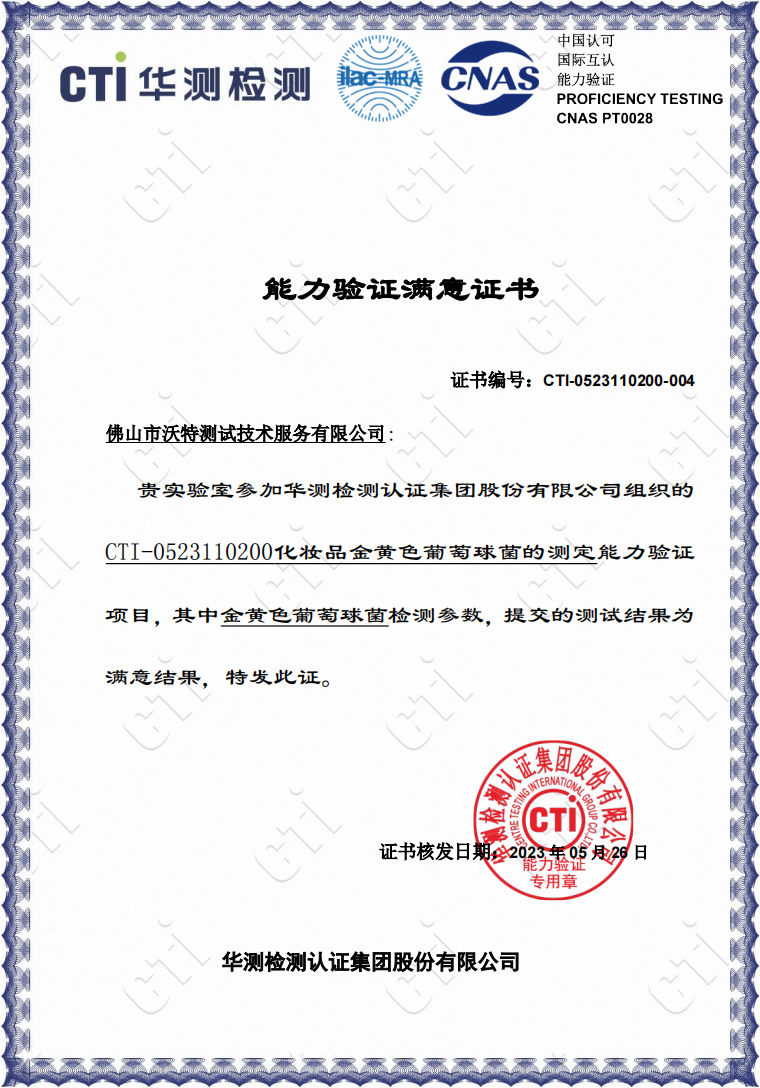 佛山沃特參加CTI-0523110200化妝品金黃色葡萄球菌的測定獲“滿意”結果
