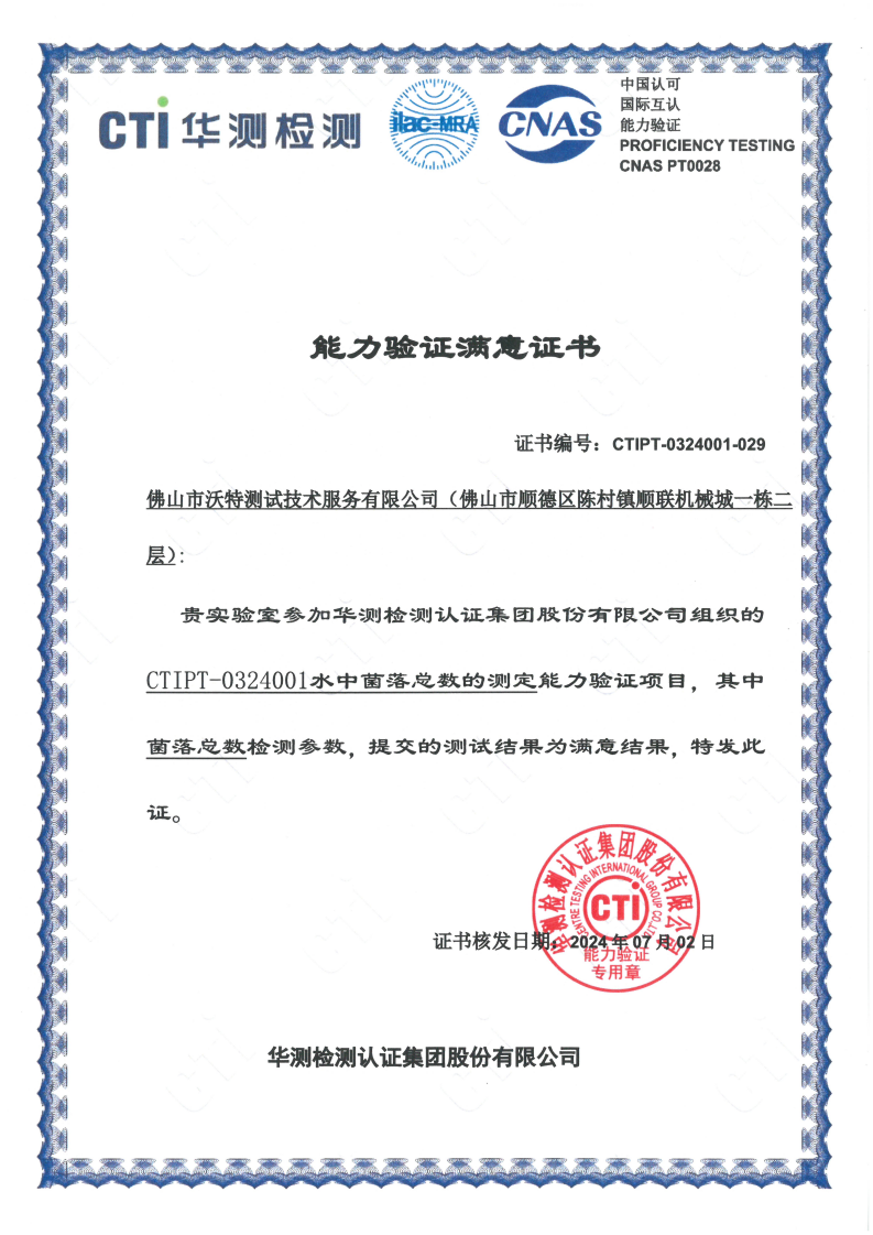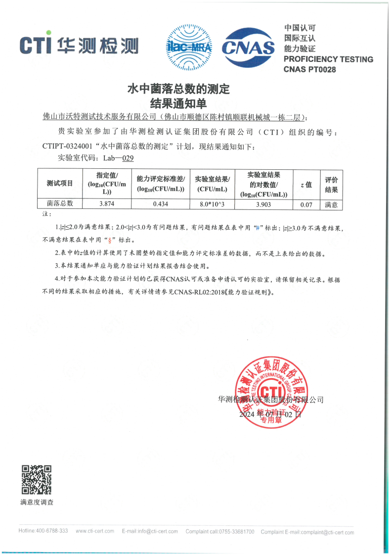 佛山沃特參加CTIPT-0324001水中菌落總數(shù)的測定能力驗(yàn)證 獲“滿意”結(jié)果