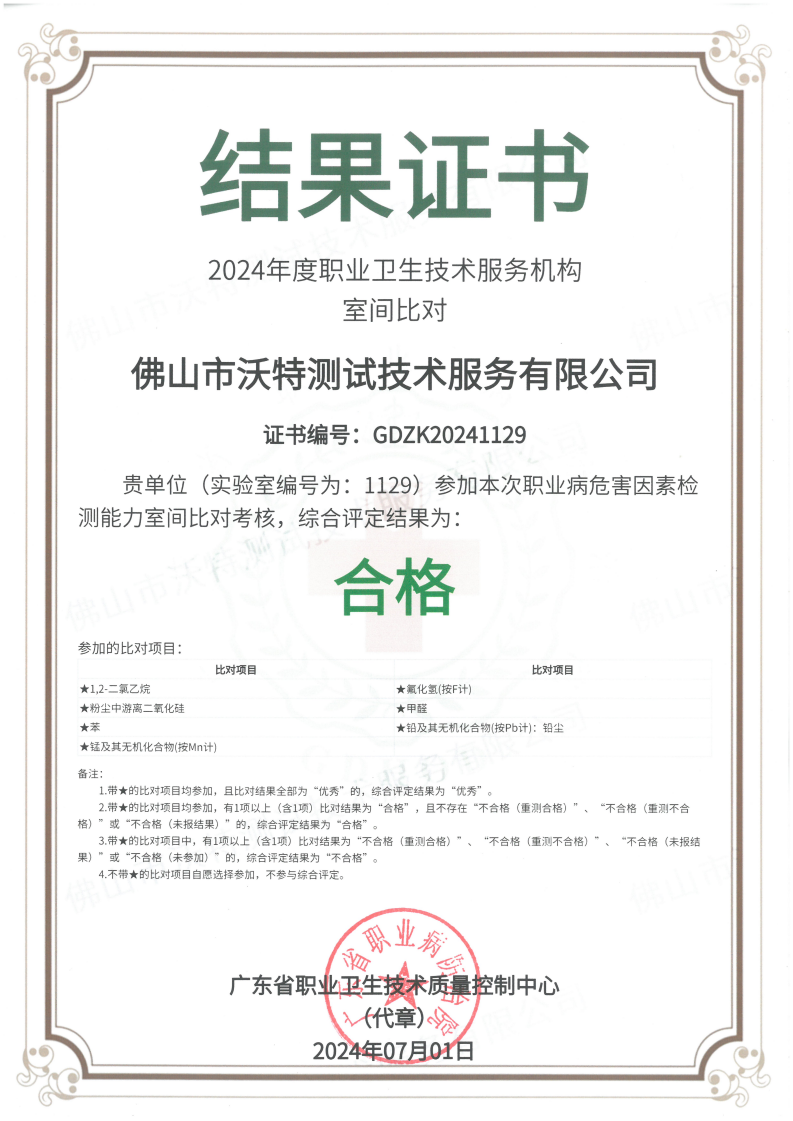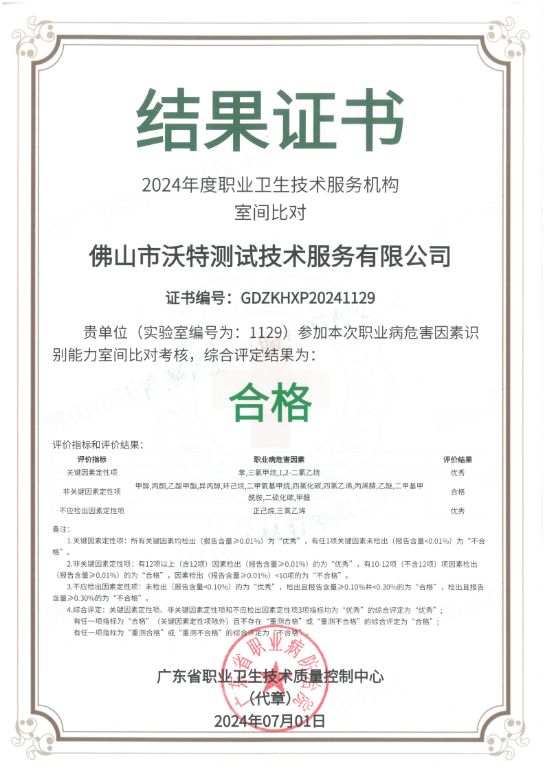 近日,佛山市沃特測試技術服務有限公司(以下簡稱“佛山沃特”)參加了廣東省職業衛生技術質量控制中心組織開展的2024年度職業衛生技術服務機構室間比對(職業病危害因素識別能力、檢測能力)考核,綜合評定結果均為“合格”。