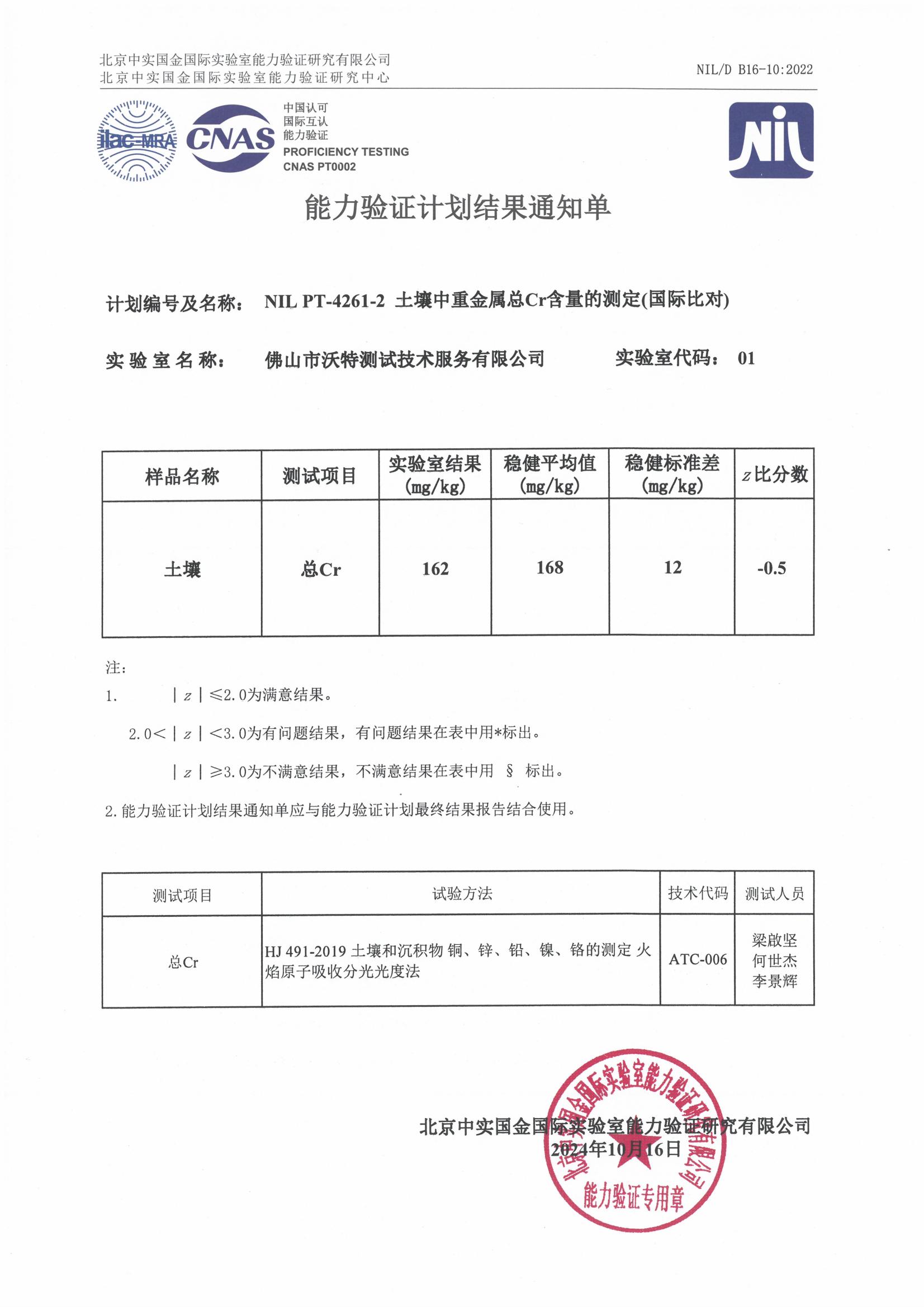 佛山沃特參加NIL PT-4261-2 土壤中重金屬總Cr含量的測定能力驗證 獲“滿意”結果
