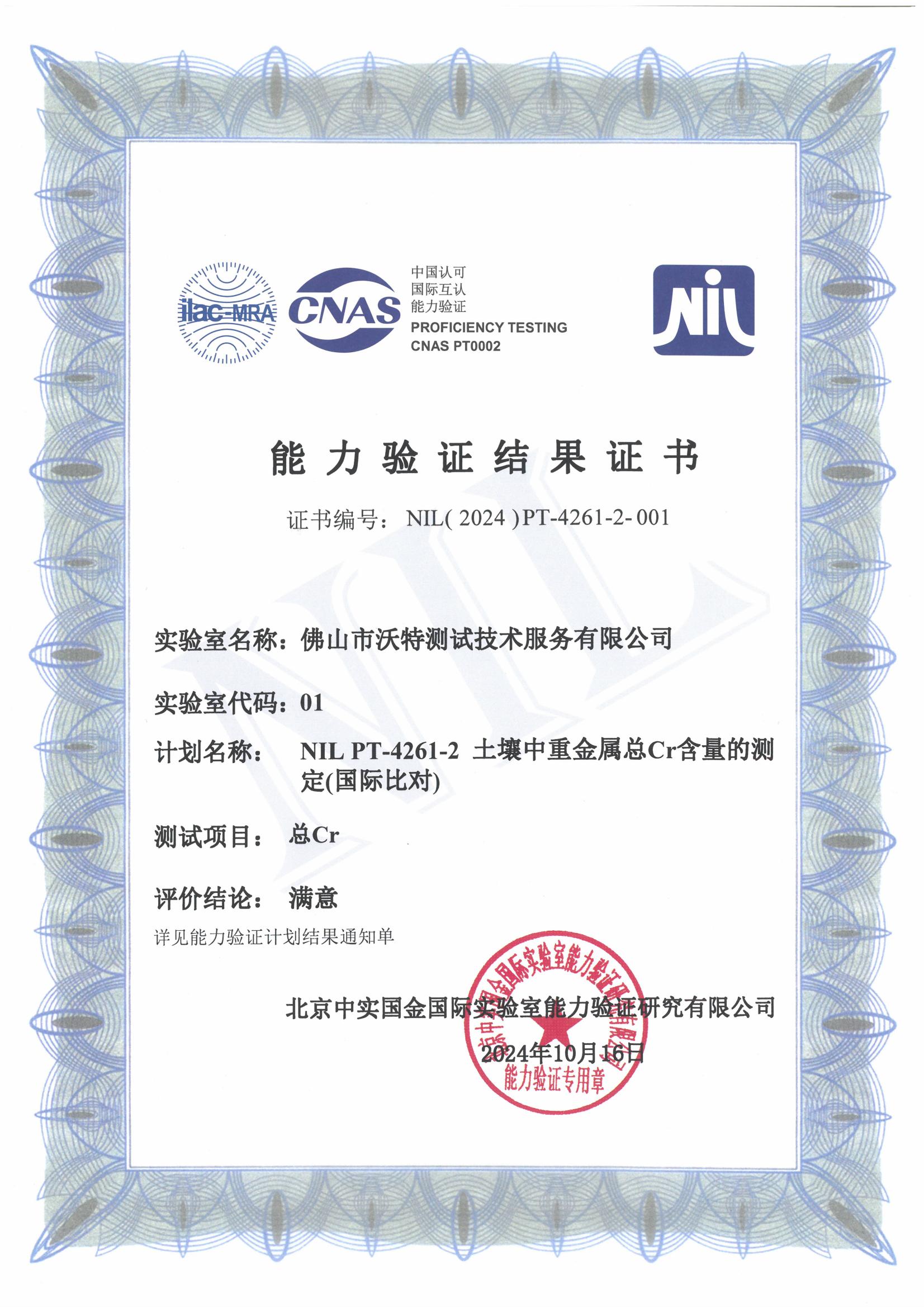 近日,佛山市沃特測試技術服務有限公司(以下簡稱“佛山沃特”)參加北京中實國金國際實驗室能力驗證研究有限公司組織的NIL PT-4261-2 土壤中重金屬總Cr含量的測定(國際比對)能力驗證計劃,其中總Cr測試項目,評價結論為滿意。