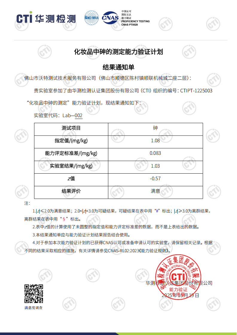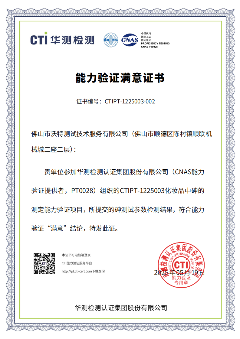 佛山沃特參加CTIPT-1225003化妝品中砷的測定能力驗(yàn)證 獲“滿意”結(jié)果