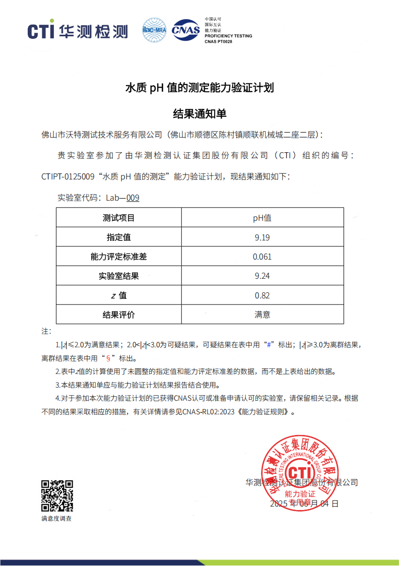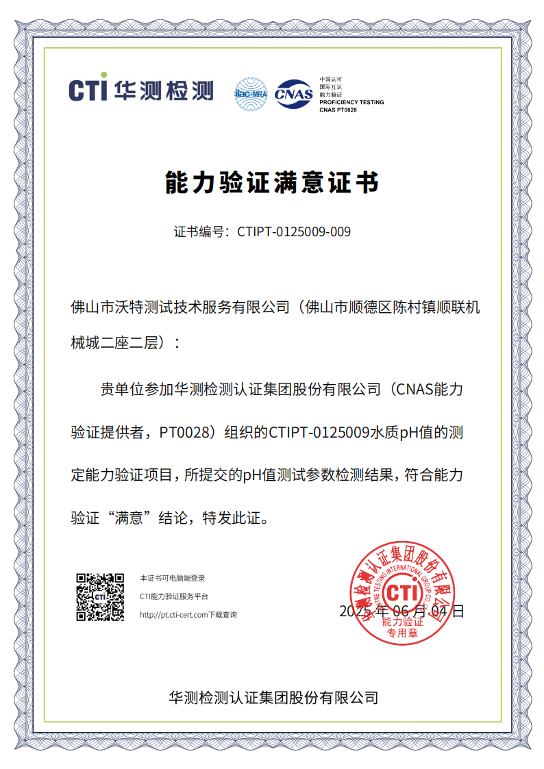 佛山沃特參加CTIPT-0125009水質(zhì)pH值的測定能力驗證 獲“滿意”結果
