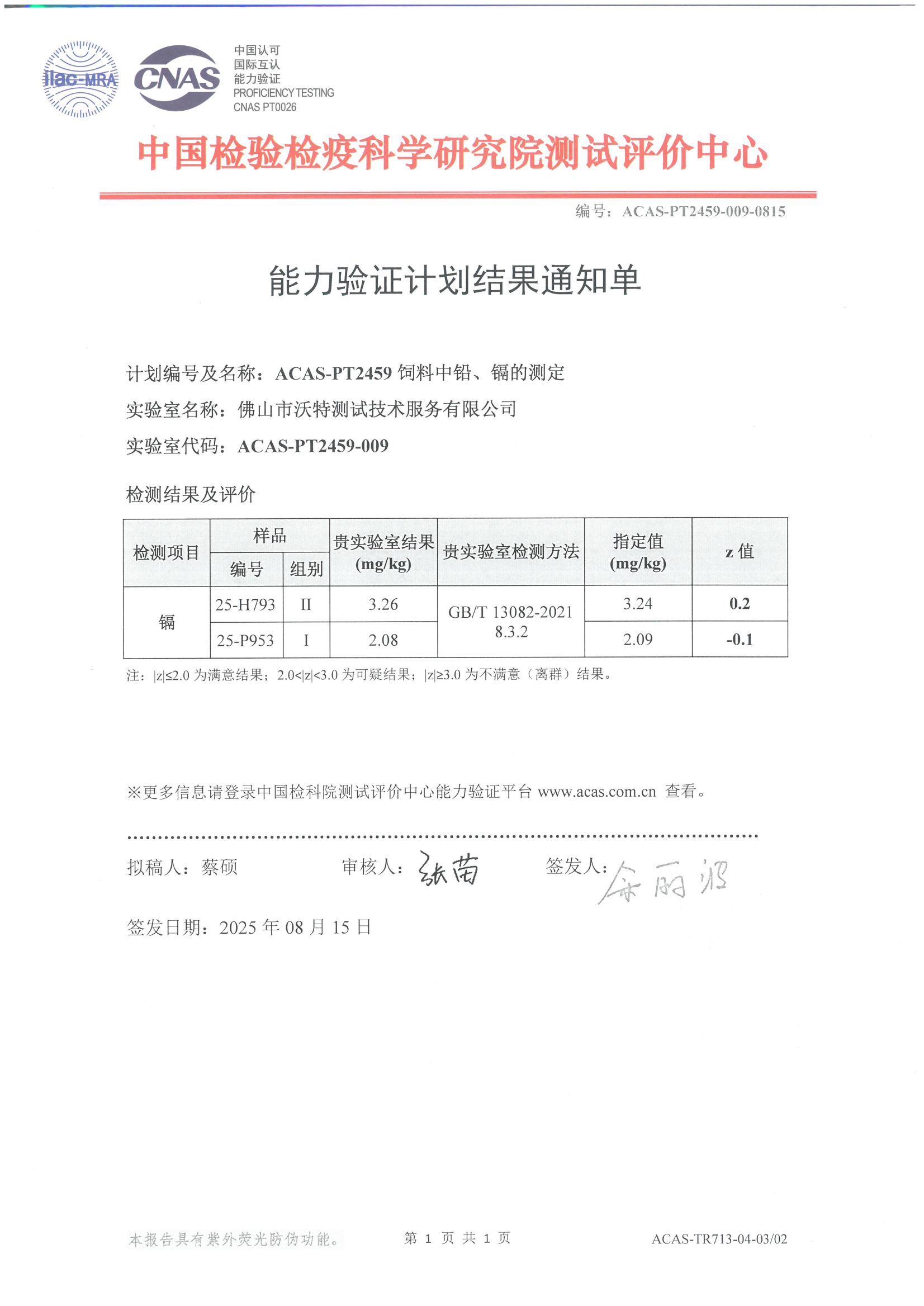 近日,佛山市沃特測試技術服務有限公司(以下簡稱“佛山沃特”)參加中國檢驗檢疫科學研究院測試評價中心組織的ACAS-PT2459飼料中鉛、鎘的測定能力驗證計劃,其中鎘檢測項目,結果評價為滿意。