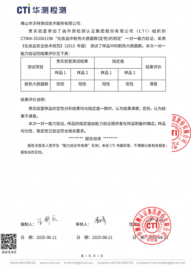佛山沃特參加CTIMA-352501196化妝品中耐熱大腸菌群(定性)的測(cè)定能力驗(yàn)證 獲“滿意”結(jié)果