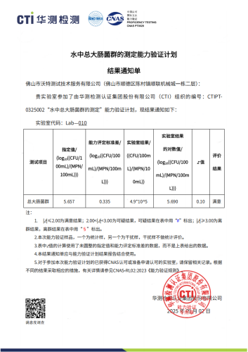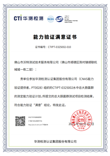 佛山沃特參加CTIPT-0325002水中總大腸菌群的測定能力驗證 獲“滿意”結果