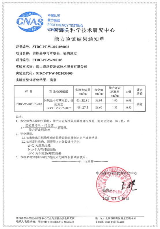 近日,沃特檢驗集團佛山分公司參加中國海關科學技術研究中心STRC-PT-W-202105 紡織品中可萃取鉛、鎘的測定能力驗證,并獲得滿意結果。