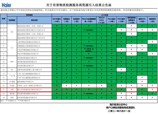 2021年3月,佛山沃特參與“海爾集團(tuán)有害物質(zhì)檢測服務(wù)商資源引入”的公開招標(biāo)。在為期三個(gè)月的資格審查、檢測能力評估下,佛山沃特憑借先進(jìn)的實(shí)驗(yàn)室配置、專業(yè)的檢驗(yàn)檢測能力,以及廣泛的國際權(quán)威機(jī)構(gòu)及品牌客戶認(rèn)可,最終中標(biāo)該項(xiàng)目,成功成為了海爾集團(tuán)及其供應(yīng)商指定的第三方檢測機(jī)構(gòu),為其提供一站式專業(yè)檢測技術(shù)服務(wù)和綠色解決方案。