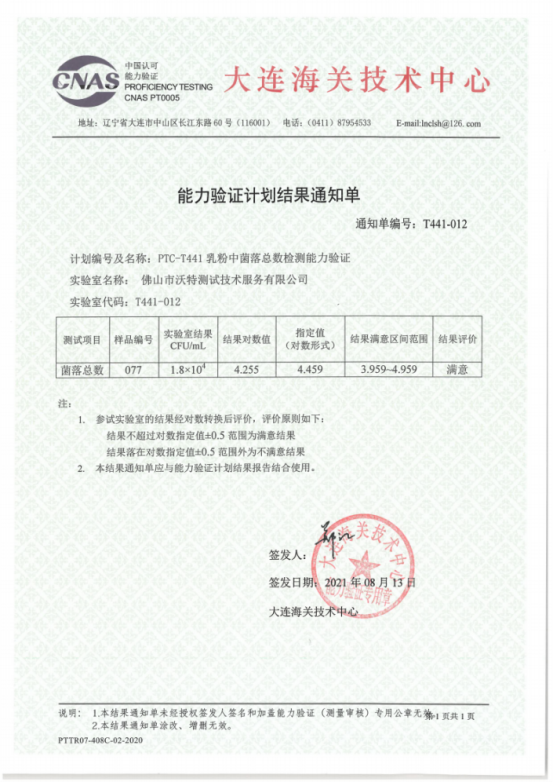 PTC-T441 乳粉中菌落總數檢測 能力驗證計劃結果通知單